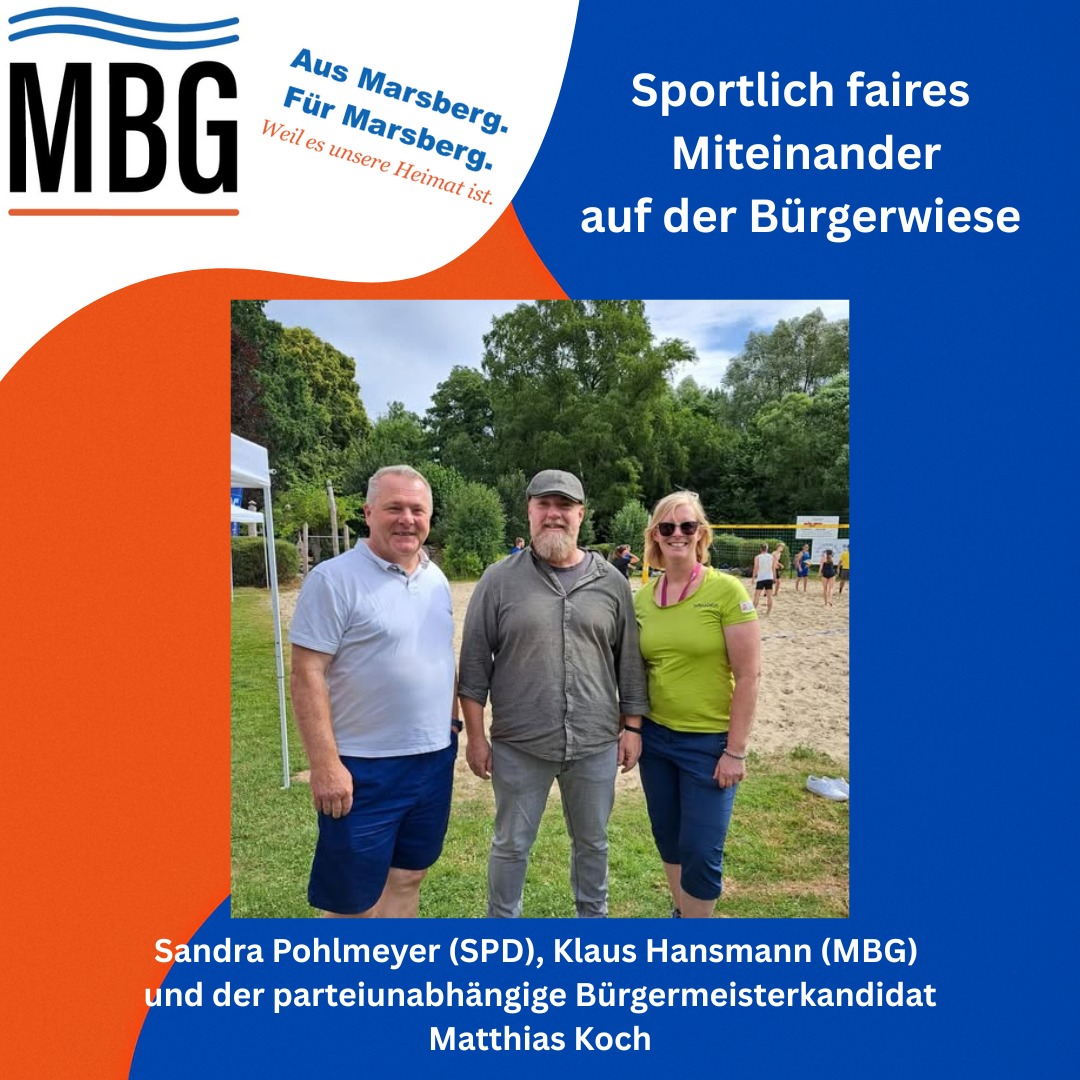 Beim Marsberger Beachvolleyballturnier auf der Bürgerwiese-Marsberg , veranstaltet vom TV Marsberg und der Bürgerhilfe Marsberg, trafen sich Sandra Pohlmeyer (SPD), Klaus Hansmann (MBG) und der parteiunabhängige Bürgermeisterkandidat Matthias Koch.