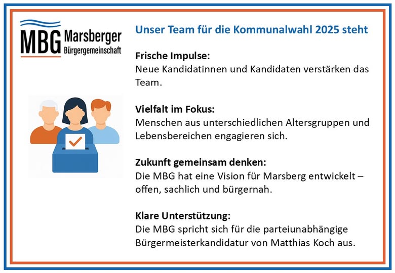 MBG startet mit neuer Energie in die Kommunalwahl 2025 Am 26. Mai hat die Marsberger Bürgergemeinschaft (MBG) ihre Liste für die Kommunalwahl verabschiedet. Mit engagierten Menschen aus verschiedenen gesellschaftlichen Bereichen und Altersgruppen bringt die MBG frischen Wind in die Marsberger Kommunalpolitik. Viele neue Kandidatinnen und Kandidaten treten erstmals in den Wahlbezirken an – ein klares Zeichen für Aufbruch und Beteiligung.